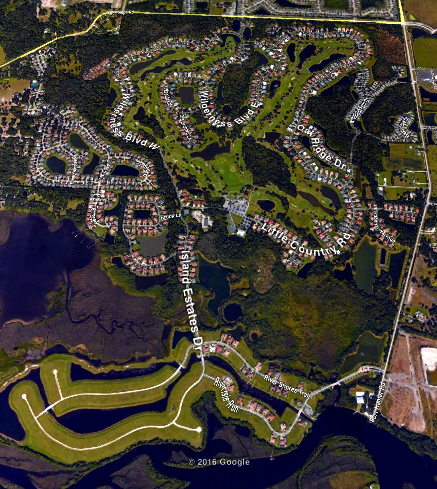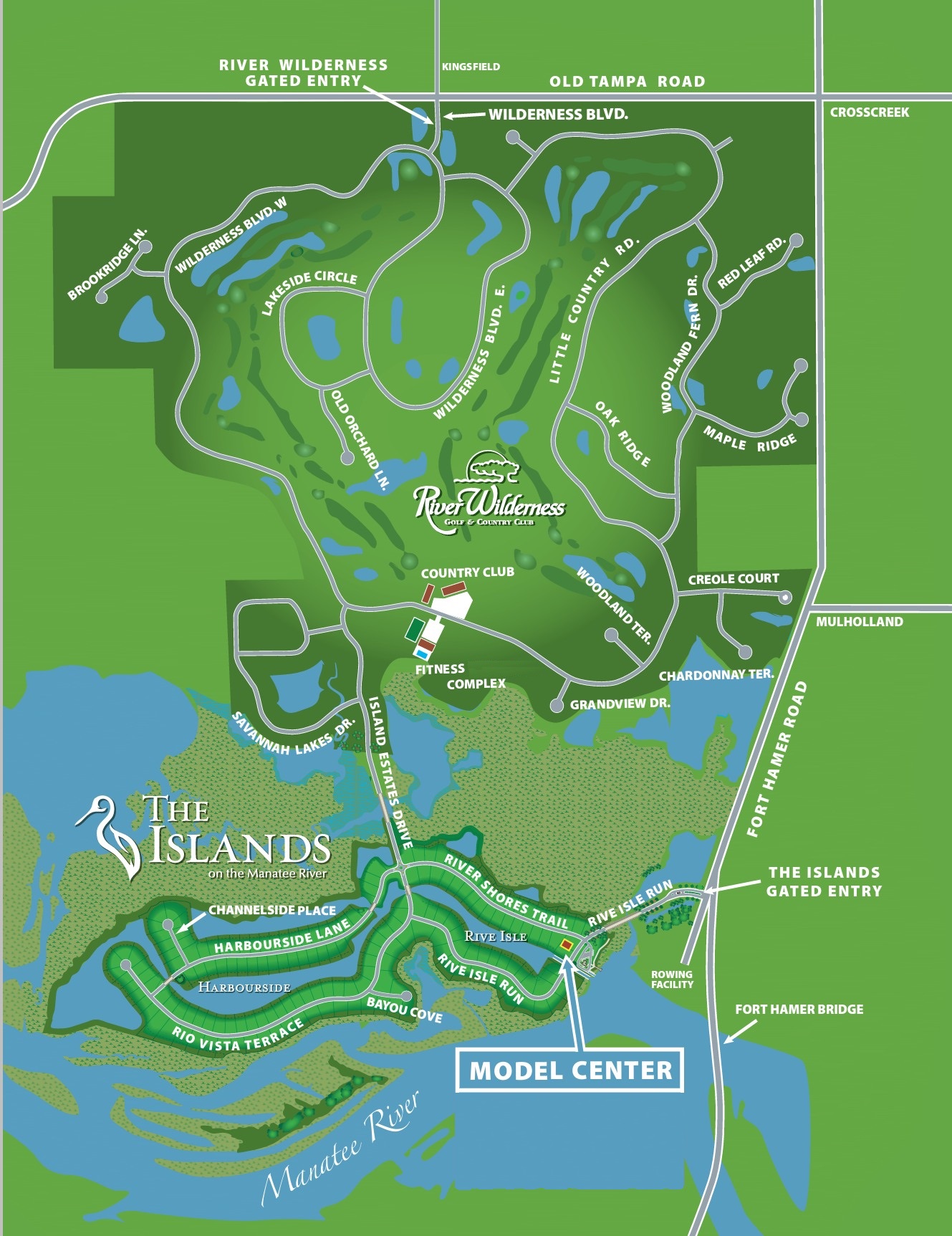 Our gated golf course community that was developed from 1985 – 2016, with a total of 800 homes back then. The homes in River Wilderness are set amongst an 18-hole golf course, offering country living at its best. RW is just 6 miles southeast of exit 224 of I-75 in Parrish, FL. Parrish is perfectly positioned between the Tampa/St. Petersburg area and the Bradenton/Sarasota area. By car, we are 2 hours from Orlando, 30 minutes from the Gulf beaches, 5 minutes from our own boat ramp on the scenic Manatee River, and 1 minute from the golf course! Our community is located on 1500 acres and contains over 900 completed homes. We are still growing. Our newest sections, “The Islands” and “Cypress Glen,” are under construction. Newly constructed homes in The Islands offer private harbors and individual boat docks with direct access to the Manatee River and beyond. Cypress Glen offers maintenance-free homes.